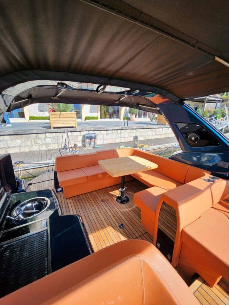 • Sunbathing and Relaxation Zone: The stern features a large C-shaped sofa, which easily converts into a wide sun deck, ideal for relaxing while at anchor.